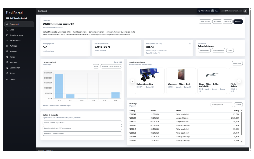 Im FlexiPortal erhalten Kunden Zugriff auf Aufträge, Verträge, Retouren und Support-Tickets inklusive Such- und Filterfunktionen. Dokumente wie Auftragsbestätigungen, Lieferscheine, Rechnungen und Gutschriften stehen direkt als PDF bereit. Zusätzlich ist ein integrierter B2B-Shop enthalten, über den Bestellungen ausgelöst und automatisch als Auftrag in weclapp angelegt werden können.
